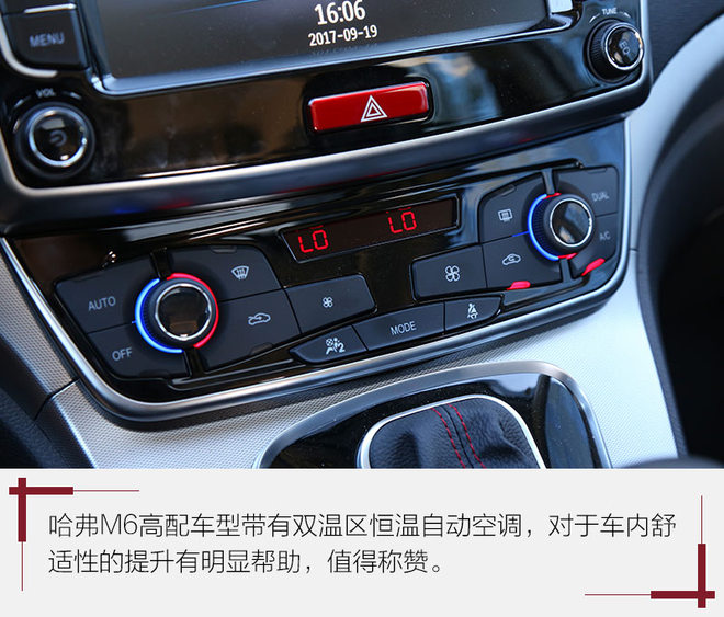 内饰总体来说无论是设计还是配置,一切归于朴实无华,简单实用,但是在配置方面,博世的第九代ESP集成系统、包括上坡辅助、陡坡缓降、4安全气囊、胎压监测、和科技配置无钥匙进入、无钥匙启动、倒车影响、GPS导航双温区自动空调等非常齐全,对于8-10万元区间的自主品牌SUV来说,哈弗M6拥有绝对的竞争优势。