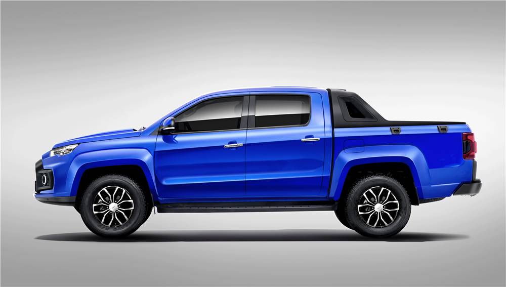 新车在侧面腰线的提升下,视觉重心比SUV还高出许多。货栏外侧设计的锚点实用且并未占用内部装载空间,货架也让整车造型更佳丰满,侧杠则大大方便了乘客的进出。