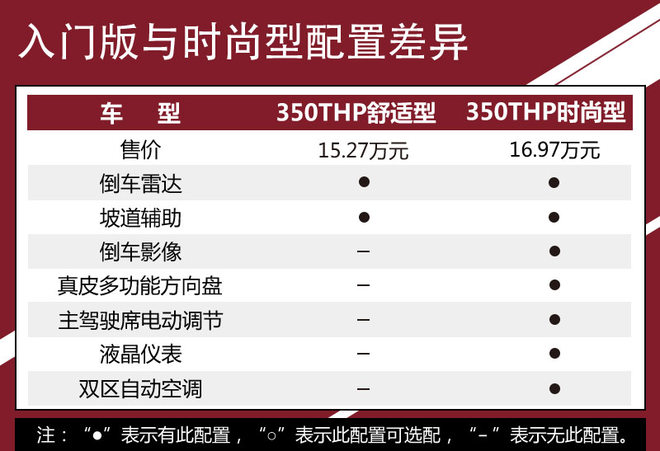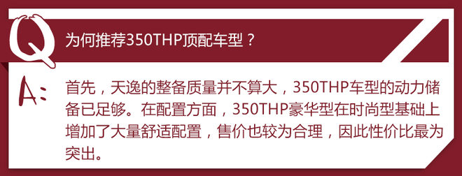 考虑到天逸的定位,且全系均采用前驱形式,1.6T发动机的动力储备已经足够,并且较低的售价也更具竞争力,因此我们优先推荐选择1.6T(350THP)车型。其中,天逸350THP 豪华型整体配置布局较为全面,同时售价也极具竞争力,是我们首选推荐车型。