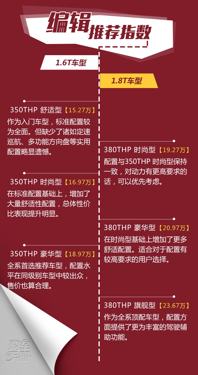 或许你希望获得更充沛的动力表现,当然也不妨考虑选择1.8T车型。从日常使用角度看,1.8T车型中的入门版车型实际上已经足够满足使用需求。