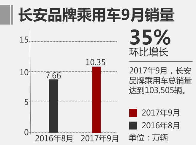今年9月,长安汽车总销量共售出262,070辆,环比增长了28%,实现了显著的增长。其中,长安品牌汽车销量为142,372辆,环比增长达到了32%;而长安品牌乘用车在今年9月的整体销量则是达到了103,505辆,实现了35%的明显涨幅。