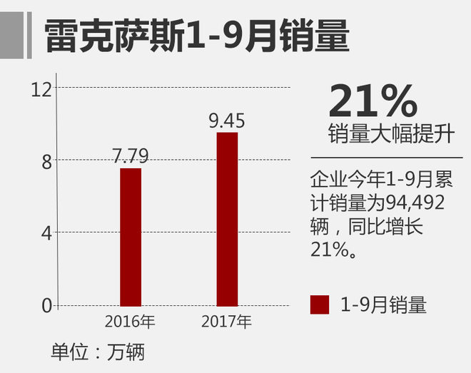 “雷克萨斯经营法则”的深化落实与品牌力的提升,使雷克萨斯在销量上一直处于稳定增长态势,企业今年1-8月份累计销量达到82,664辆,同比增长23%。网通社从雷克萨斯官方获悉,今年1-9月企业累计销量达94,492辆,同比增长21%。雷克萨斯2017年前9月的销量已经接近10万辆大关,距2016年全年销量109,150辆仅差1万余辆,这也一定程度上说明雷克萨斯今年在华的出色表现。