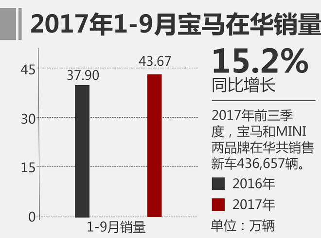 今年1-9月,宝马和MINI两品牌在华共销售新车436,657辆,同比增长15.2%,刷新历史同期最高销量纪录。同时,今年9月单月两品牌销量达到了52,681辆,创下宝马集团在华单月最高销量纪录。