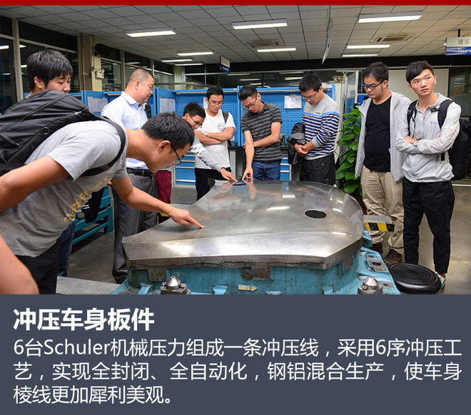 冲压是生产高尔夫的第一道工序,一块展平的板料经过6台Schuler机械压力组成一条冲压线,形成一块车身棱线清晰、曲线精致的车身板件。在新款高尔夫身上具备了先进的冲压工艺,具备铝件生产能力,可在5分钟内实现包括端拾器在内的全自动模具更换,整车间自动化率达到90%以上。