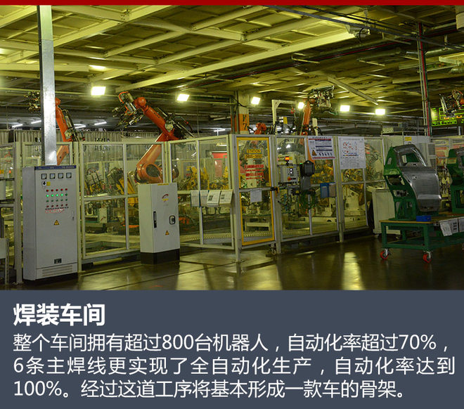 在冲压车间“塑形”完成的内外车身板件将转交由第二道工艺,焊接车间进行完成。焊装的整个过程是通过对下部总成(包括底板、纵梁以及前后挡板)、侧围板以及车门、前后盖和翼子板进行装配,基本形成一款车的骨架,也叫做白车身。