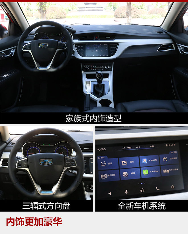新车的内饰采用了吉利博越等车型上广受好评的家族式设计,平滑的曲线、缝线工艺的应用让这款车的内饰更加豪华,富有格调,多媒体的按键分布也很有层次。仪表盘内部加入了一块尺寸更大的液晶显示屏,可以更好的映射车辆信息。