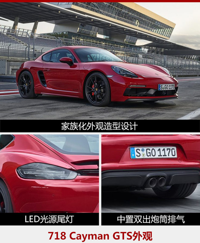 外观方面,保时捷718 Cayman GTS外观整体采用硬顶双门跑车的设计风格。与Panamera相同的多点式LED光源头灯分布在车头两侧,在保险杠两侧还配有独特的LED日间行车灯。车尾部分LED光源尾灯夜间点亮效果辨识度较高,中置双出炮筒排气尾喉更彰显整车的运动风格。
