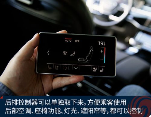 可拆卸的后排控制器来自中国的和硕,可以像一个平板电脑一样拿在手上,实现后部空调、座椅功能(加热、通风、按摩)、灯光、遮阳帘等控制。