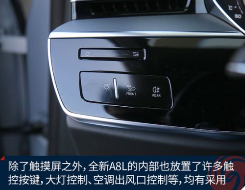 触控也是全新A8L的内部基调,除了强大的多屏系列全都支持触控之外,像灯光控制、车内照明开关、空调出风口调节、甚至连车内的车门把手都是轻触即用。
