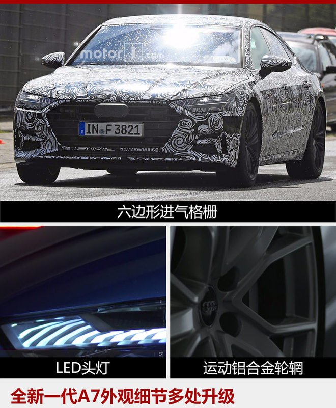 外观方面,从此前获得的谍照来看,全新一代A7依旧采用修长的轿跑车身,并延续初代车型经典的溜背式设计,同时还借鉴全新一代奥迪A8车型的设计风格,大尺寸六边形进气格栅用镀铬饰条进行装点,展现大气的同时又增强一定时尚的视觉效果,中网部分熏黑处理后更加犀利;侧面装载的全新样式铝合金轮辋更显示出其运动的特点。
