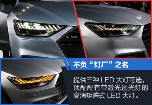奥迪在“灯厂”的道路上依旧是高速飞奔,奥迪A7 Sportback为不同配置提供了三种LED灯光可选,其中顶配车型带激光远光灯的高清矩阵式LED大灯,采用了独特的水平结构,造型更具辨识度。