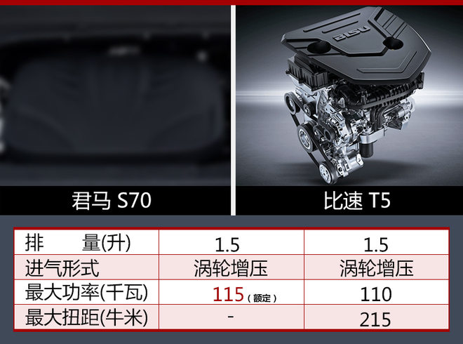 同级别车型中,比速T5同样搭载一台1.5升涡轮增压发动机,最大功率为110千瓦;通过对比后发现,君马S70所搭载的1.5升涡轮增压发动机在数据输出方面占优势。