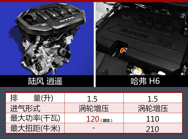 从国家工信部公布的信息可知,陆风逍遥将搭载一台型号为JX4G15A5L 1.5升涡轮增压发动机,额定功率120千瓦,百公里综合油耗7.6升。同级别车型中,哈弗H6所搭载的1.5升涡轮增压发动机,额定功率110千瓦。通过对比后发现,陆风逍遥所搭载的1.5T发动机,在数据输出方面超越竞品车型。