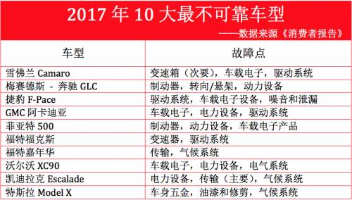 10月19日,美国权威杂志《消费者报告》(Consumer Report)发布了今年汽车可靠性调查报告,报告中,特斯拉的Model X电动SUV车型被列入10大最不可靠车型,得分低于同时入选的F-Pace和GMC Acadia等,可以说是特斯拉Model X被《消费者报告》评选为今年最不可靠的车型。在汽车可靠性调查报告中,为了得出可信的评分《消费者报告》会向车主询问了服务回访和维护等问题。包括刹车异响和内饰损坏等个小问题,以及过保后的传统系统维修和四驱系统故障等大问题,总共涉及17个领域。而至于年度10款最可靠和最不可靠车型,考核标准从道路测试、车辆可靠性、车主满意度和车辆安全四个维度综合考量。