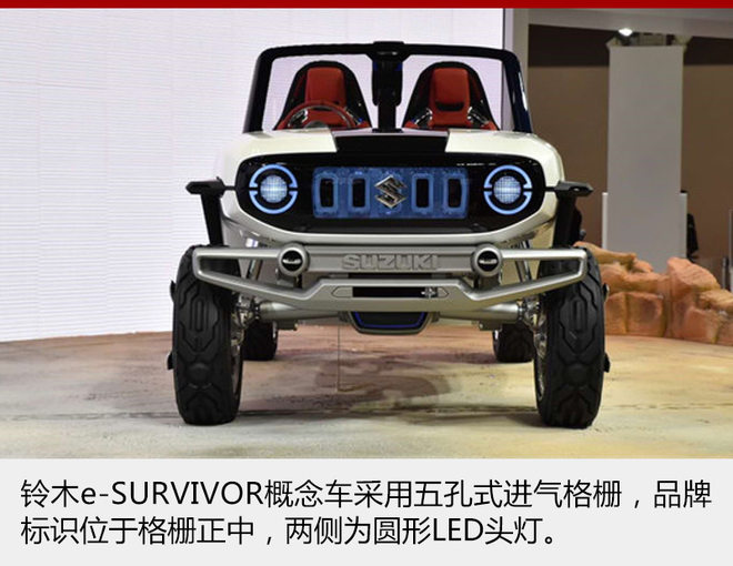 铃木e-SURVIVOR概念车的整体设计极具未来感和科技感,预示着未来铃木SUV车型的设计方向。新车采用五孔式进气格栅,且有玻璃覆盖,品牌标识位于格栅正中,两侧为圆形LED头灯。同时,头灯和格栅边缘均有淡蓝色LED灯带点缀,以凸显其纯电动车型的定位。