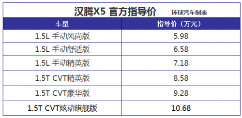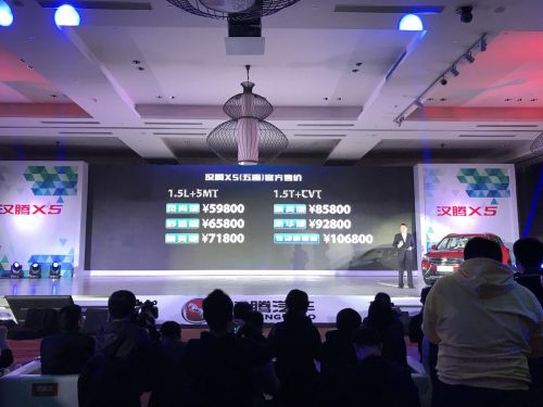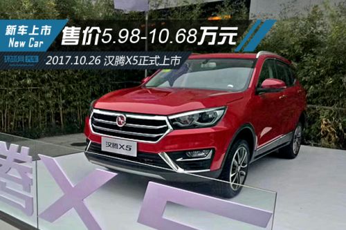 2017年10月26日,汉腾X5在西安正式上市,新车共推出2种动力共6款车型,售价区间为5.98-10.68万元。汉腾X5的上市不仅将进一步丰富了汉腾汽车的产品序列,更可以满足消费者对产品日趋多样化的需求。