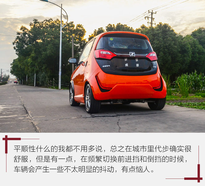 开这种小车是一种和平时开普通车完全不同的感受,首先是车身实在太小了,你会觉得它异常的容易掌控,而且车身周围的视野非常好,基本没有盲区,甚至你都不需要反光镜就能知道身边有什么障碍物,总之特别有趣。另外需要提一点的是,在行驶过程中虽然很平顺,但是在你进行换挡的之后的一瞬间,车辆会有一些不太明显的抖动,不太符合电动车的特性。