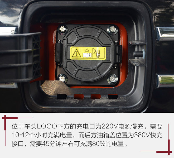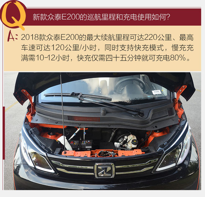 和现在绝大多数电动车一样,众泰E200提供了快充慢充两种充电模式,快充可以在45分钟左右充满80%左右的电量,而慢充则需要10-12个小时可以完全充满;24.5千瓦时的三元锂电池组理论可以达到220公里的巡航里程,最大功率60千瓦的永磁同步电动机则可以使车辆达到120公里/小时的最高时速,这么看E200的数据完全达标,甚至还有些优秀。