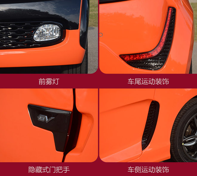 众泰E200在营造运动氛围上做了很大的功夫,例如双色车身、隐藏式门把手、红色卡钳、位于车侧和车尾的发动机散热装饰等等,这些都不影响它小巧可爱的风格,又在一定程度上增加了它的运动氛围,所以还是挺成功的,至于消费者能不能喜欢,这就要看个人的口味了。