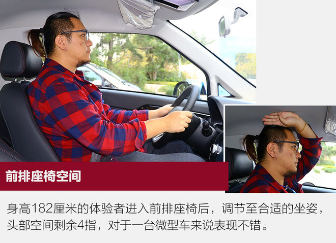 对于一台微型车来说,身高182厘米的体验者进去还能有不错的头部空间,这样的表现已经非常不错,不过要说一点的是,E200的座椅虽然支持电动调节,但是并不支持高低调节,方向盘也不能以任何方式调节,所以找到合适的坐姿并且适应可能要花一些时间。