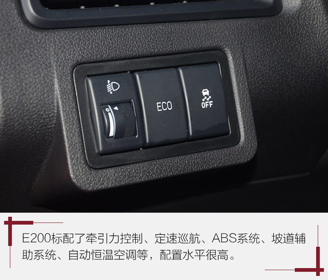 E200作为这个级别的车型,对于它的内饰做工、用料什么的可以不用有太大的期待,只要功能性良好就够了;它的内饰整体偏向简约,中间一块大屏占据了基本全部的功能,视觉效果还不错,也带有导航、多媒体、手机互联、倒车影像等功能,比较齐全;至于配置层面,类似ESC电子车身稳定系统、坡道辅助、定速巡航、自动恒温空调等都是这个级别中难得一见的配置,竞争力还是不错的。