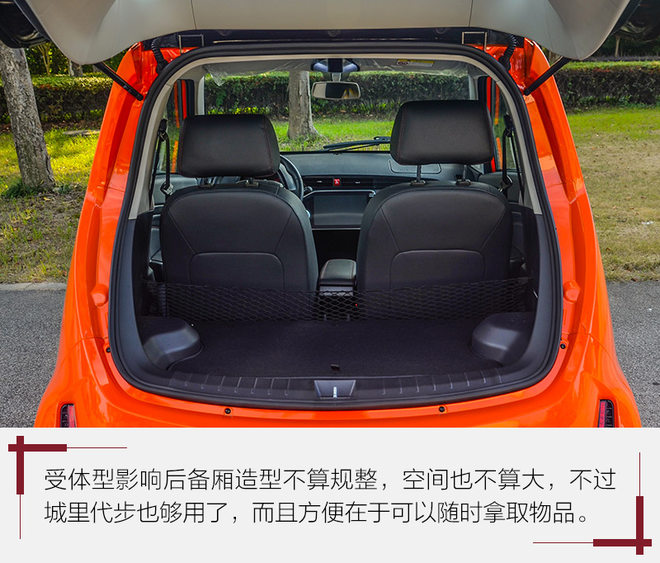 受制于车身尺寸,车内空间自然不可能表现有多出色,双座的布局也在一定程度上限制了它的受众群体;不过对于城里代步来说,载上两位乘客,车内的空间也不算过于拘束,储物空间也基本够用,后备厢可以看成一个大号的储物格,因为在行车过程中可以随时拿取,这点很方便。