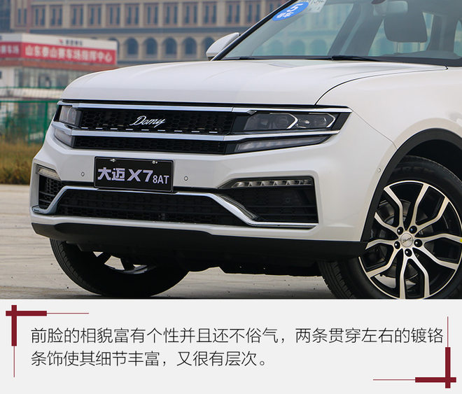 大迈X7有自己的风格,造型大气时尚,这主要是由于前脸采用了与头灯组相连的贯穿式中网,其中的镀铬饰条有个性并且还不俗气。中间布置有“Domy”徽标,而下格栅的镀铬线条从左到右,营造出更强的整体感。