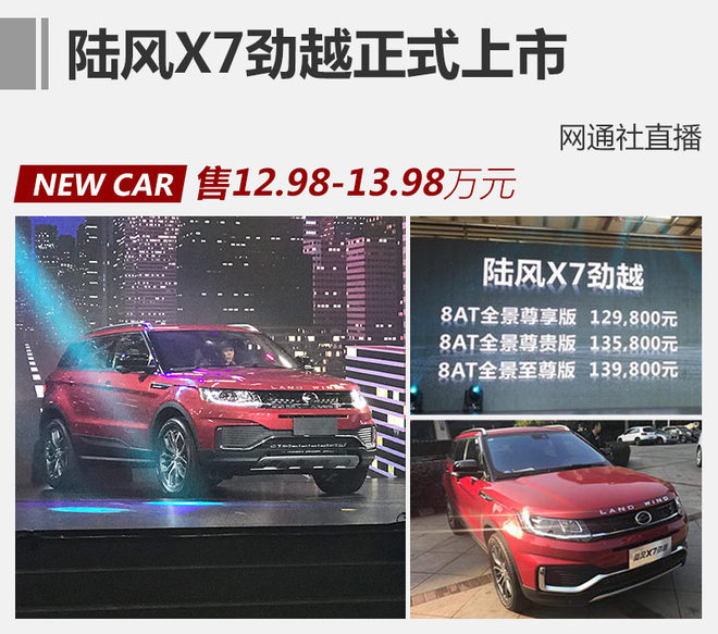 X7是陆风旗下的一款紧凑级SUV,现款车型曾与2015年8月正式上市。根据企业产品规划,新车也即将迎来中期改款,并命名为陆风X7劲越。网通社从陆风汽车官方获悉,陆风X7劲越正式上市。新车将提供1.5T一种动力共计3款车型,售价区间为12.98-13.98万元。此外,在新车上市的同时,位于南昌的江铃控股发动机工厂也在今日正是落成,该工厂将通过多项高科技技术以及高标准的生产线技术等综合优势,并带动起产销量快速增长的迅猛势头。
