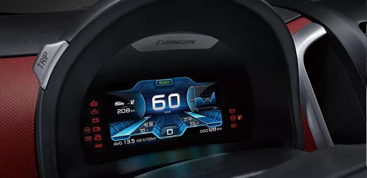 新奔奔EV260的内饰同样充满设计感,配色上还可选装“红黑”中控面板布局。不过最吸引眼球的还要数两块大尺寸液晶显示屏——6.1寸TFT全液晶组合式仪表盘与7英寸中控液晶显示屏。