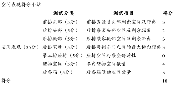 空间评测分为前排空间和后排空间两个维度。前排主要测试固定模特调整到固定座椅位置后,坐垫到车顶距离以及头部直观剩余空间;后排主要测试有三项——头部、腿部空间和后排座椅整体宽度。