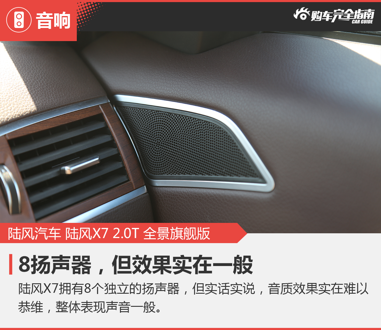 陆风X7拥有8个扬声器,在这个级别中扬声器数量可以算比较多的了,根据扬声器数量它得到了2分。但是还是要说的一点音质音效并不是看扬声器数量的,而陆风X7的效果真的叫人有些失望。