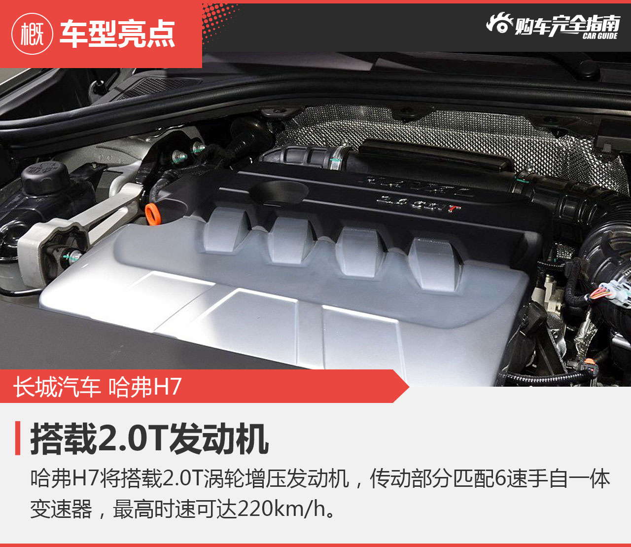 发动机舱部分显得非常宽大,从而可以更好的容纳马力强劲的发动机,这也是保障其运动性能的必要。按照先前的消息,哈弗H7将装配GW4C20A/GW-TYZ70B型号的2.0T涡轮增压发动机,峰值功率高达200kw/6000rpm,峰值扭矩更是达到了370N·m/1800-4000rpm。但是是否会出现在量产版车型上还存在不确定性因素,更大可能是采用与哈弗H8和H9相同的GW4C20型号2.0T发动机,搭配六速手自一体变速箱。这台有着直喷技术的2.0T发动机同样有着最大功率160kw/5500rpm,峰值扭矩324N·m/2000-4000rpm的不错表现。