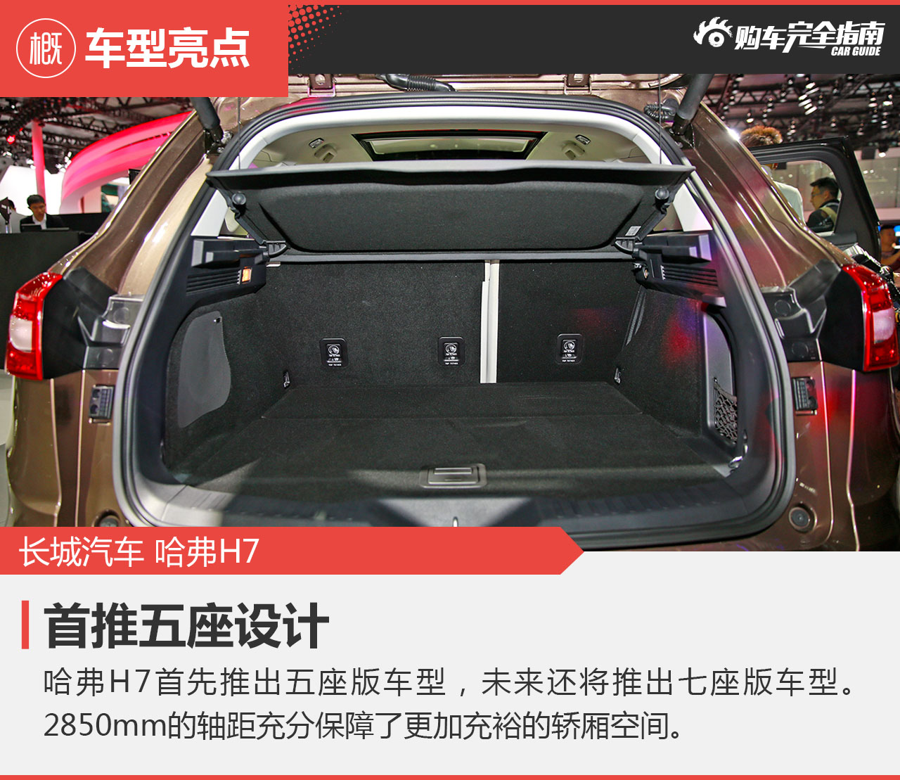 五座版的哈弗H7定位为豪华运动型SUV,它与哈弗H8的关系,就如同哈弗H6Coupe和哈弗H6的关系一样。不过哈弗H7采用全新的底盘设计,多连杆的后悬架也完全不同于哈弗H8,避免重蹈H8的覆辙,经历不必要的折腾。车身长宽高尺寸方面,哈弗H7是4677*1911*1702mm,车身长度仅仅比H6增加了28mm,宽度则大幅增加了59mm,高度反而降低了25mm,轴距尺寸达到2850mm,比哈弗H6足足加长了170mm,充分保障了更加充裕的轿厢空间,尤其是后排座位的腿部空间。