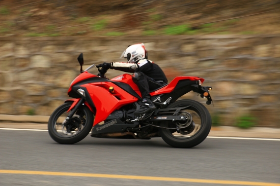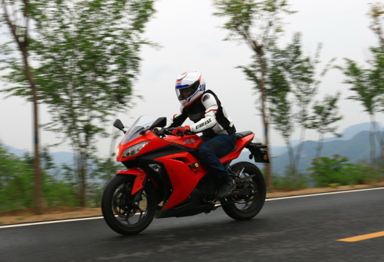 在本次体验测试的三款车中,Ninja 250的表现最为平衡,将忍者“临”(身心稳定)的称号赋予它,是再合适不过的了。Ninja 250外形犀利、颇具运动感,外观风格又与同门ZX-6R和ZX-10R酷似。双缸引擎运转的平顺性非常好,高转速爆发力强,中、尾速段加速优势明显,135公里/小时的限速不得不说是一个小遗憾。再有就是油箱尾部线形欠佳,导致腿部与车身贴合度不足。做工、减震调校、制动性等其他方面均没有发现明显缺点,新款Ninja 250还配置有滑动离合器。