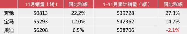 不可否认,进入四季度之后,奔驰、宝马以及奥迪都在你追我赶的竞争中大步向前。但11月过后,曾经奥迪一度领先的优势似乎开始变得松动。11月奥迪拿出了56208辆新车交易成绩单,继续卫冕所有豪华品牌单月销量冠军的位置,然而奥迪仅有6.5%的同比增幅却远低于奔驰和宝马的增长空间,这一点从年度累计销量上奥迪已经处于下风,照此发展,奥迪年度销量冠军的帽子恐怕不保。目前宝马总销量稍微领先于奔驰,但奔驰的增长趋势更加明显,到底谁能夺得年度销量桂冠尚存变数,但可以预见BBA之间的战争在12月将会是史无前例的惨烈。