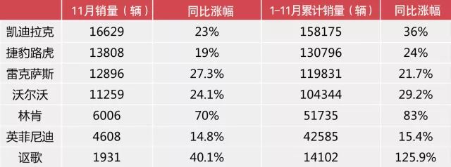 2017年11月二线豪华品牌销量简表