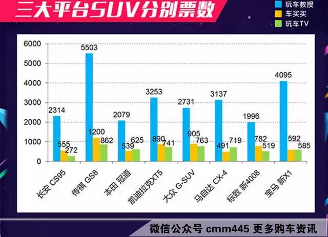 上图显示传祺GS8 (配置|询价)以7565票的高票数夺得冠军宝座,宝马新X1、凯迪拉克XT5也以高票数紧随其后,而马自达CX-4、大众G-SUV等获得的票数也不少!