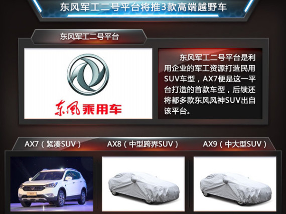 近日,网通社还从东风风神内部获悉:包括即将于年内上市的AX7在内,东风风神目前已规划了3款基于东风军工二号平台所打造的高端SUV产品,分别为AX7、AX8和AX9,其中旗舰SUV AX9已基本确定将于后年推出。