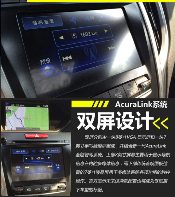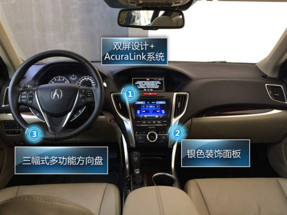 TLX的内饰大量采用银色面板装饰,整体风格低调华丽,又更运动和年轻化。采用了双屏设计,与讴歌MDX一样,由一块8英寸VGA 显示屏和一块7英寸手写触摸屏组成,并结合新一代AcuraLink全能智驾系统。上部屏幕主要用于显示导航信息在内的多媒体信息,而下部传统音响面板位置的7英寸液晶屏用于多媒体系统各项功能的触控操作。新车配备的先进的双屏设计、AcuraLink(全能智驾)系统等豪华智能配置,官方表示未来这两款配置也将成为讴歌旗下车型的标配。