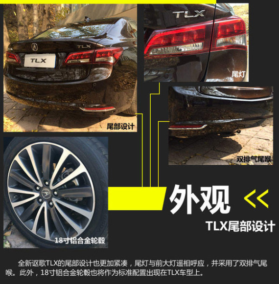全新讴歌TLX的尾部设计也更加紧凑,尾灯与前大灯遥相呼应,并采用了双排气尾喉。此外,18寸铝合金轮毂也将作为标准配置出现在TLX车型上。