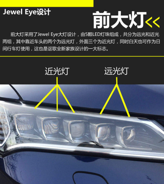 全新TLX在外观上延续了此前概念车的设计,相比现款车型车身线条设计更为动感时尚。盾形的前格栅配以大尺寸的镀铬装饰相呼应,简洁的前保险杠下方设计有两个硕大的进气口,并采用蜂窝状造型,具有很强的视觉冲击力。并且前大灯采用了Jewel Eye大灯设计,由5颗LED灯珠组成,共分为远光和近光两组,其中靠近车头的两个为远光灯,外面三个为近光灯,同时白天也可作为日间行车灯使用,这也是讴歌全新家族设计的一大标志。