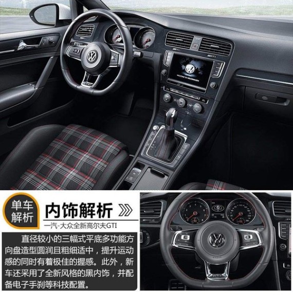 全新一代高尔夫GTI采用了高尔夫7的内饰设计风格,略向驾驶位倾斜的贯通式中控台使用钢琴烤漆面板,在质感上比上一代的黑塑料要凸显质感得多,视觉感受得以提升。直径较小的三幅式平底多功能方向盘造型圆润且粗细适中,红色缝线作为特色得以保留。和第六代高尔夫GTI相比,新车内饰格局更显简约。此外,在电子设备上,新车加入了电子手刹、AUTO HOLD等多项科技配置。