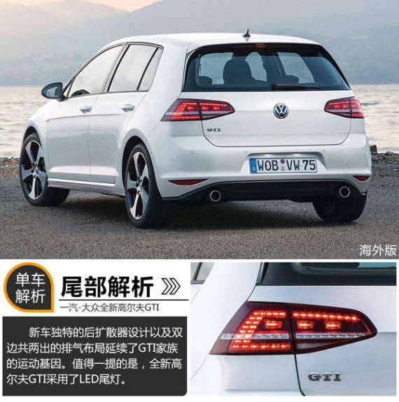 新车独特的后扩散器设计以及双边共两出设计的排气布局延续了大众GTI家族的运动基因。与第六代相比,一汽-大众全新的第七代高尔夫GTI加入了些许线条,使其尾部轮廓清晰、棱角分明。全新设计的尾灯采用了全LED光源,为这款动感小车增添了几分优雅的气息。