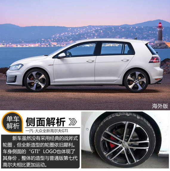 一汽-大众全新高尔夫GTI在国产之后并没有采用经典的战斧式轮圈,但全新双五幅造型的双色轮圈依旧犀利。新车的侧身线条与第六代GTI相比更加硬朗,翼子板上的“GTI”LOGO也体现了其与普通版第七代高尔夫不同的运动车身份。同时在车身侧面的下部加入了一条细小的侧裙,除了具有防擦的作用之外,还有一定的空气动力作用。