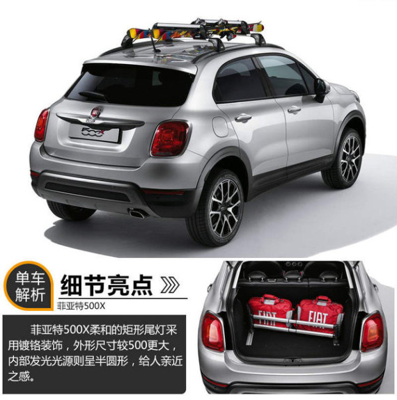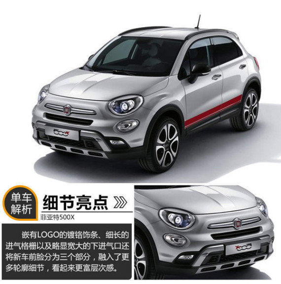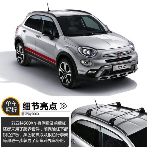 菲亚特500X定位小型跨界SUV,与Jeep自由侠共享Small Wide平台。新车在外形设计方面将与菲亚特500家族保持一致,但是拥有更多的跨界风格设计和配置,例如新增的车顶行李架和车尾扰流翼。新车最快将于明年初上市销售,未来有望借助广汽菲亚特资源实现投产。