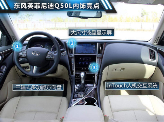 外观方面,东风英菲尼迪Q50L与英菲尼迪Q50车型保持着大概一致的风格,只是尾部的“东风英菲尼迪”和“Q50L”字样表明了国产车型的身份。菱形的中网加有银色镀铬装饰,前大灯采用了LED光源,并且加入了日间行车灯。在内饰上,配有三幅式的多功能方向盘,大尺寸液晶显示屏。以及搭载英菲尼迪独家的InTouch人机交互系统。