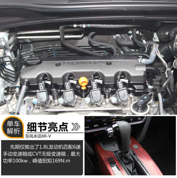 在动力方面,东风本田XR-V将采用本田最新的Earth Dreams Technology动力总成技术,该车率先使用一台1.8L发动机,该引擎最大功率为103千瓦,峰值扭矩达到174牛米。传动方面,与这款发动机相匹配的将是6速手动变速箱或CVT变速箱。