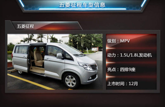 五菱征程采用了五横幅式大面积盾形前进气格栅,前大灯采用造型犀利的多边形设计,让新车前脸看起来十分犀利。该车长宽高分别为5090mm/1780mm/1925mm,轴距为3205mm。五菱征程最大的特点是提供7座版和9座版两种选择,7座版配备三排座椅,9座版则配备四排座椅。面对越来越细分化的MPV市场,五菱征程将以大空间和舒适度的特点去攻占MPV市场。动力方面,五菱征程将搭载1.1.5L和1.8L两款汽油发动机,燃油经济性方面1.5L车型8.4L/100Km、1.8L车型8.8L/100Km。(网通社 2014年12月1日 北京报道)