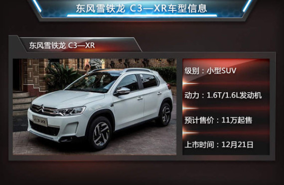 在本月即将推出的SUV中,东风雪铁龙C3—XR可谓是备受瞩目。 在广州完成了中国首秀后,该车将于12月21日正式上市销售。目前新车已正式启动预售。动力方面,东风雪铁龙C3-XR将搭载1.6THP涡轮增压发动机,最大功率120kw,峰值扭矩240N.m,与之匹配的是一款6速手自一体变速箱。此外该车还有1.6L自然吸气发动机可选。C3-XR搭载了多路况适应系统,可选择公路、沙地、雪地和泥地等多种驾驶模式。