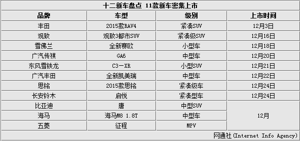 年底临近,各种新品、促销活动层出不穷,过年买大件是中国人一大消费习惯,对于车的需求在年底也会显得更为突出。为迎合国人这一消费习惯,各大厂商汽车市场在年末会推一批新车,为年底冲量的同时为明年的销量做预热。今年年底还有哪些新车值得期待?近期,网通社针对12月即将上市的新车做了一翻梳理。本月至少会有11款车上市销售,SUV依然是其中的热门车型,将多达4款,其中将 包括东风雪铁龙CX-3以及观致3 都市SUV等。